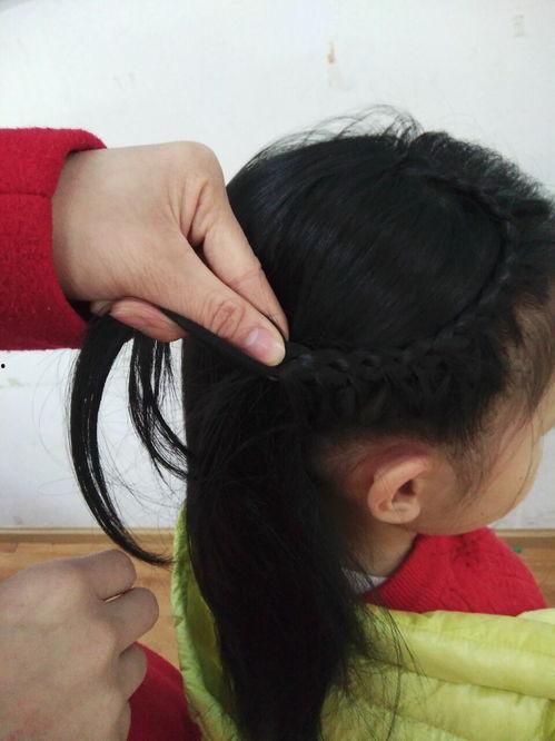 2. 将一股头发编成辫子,另一股头发扎成马尾。